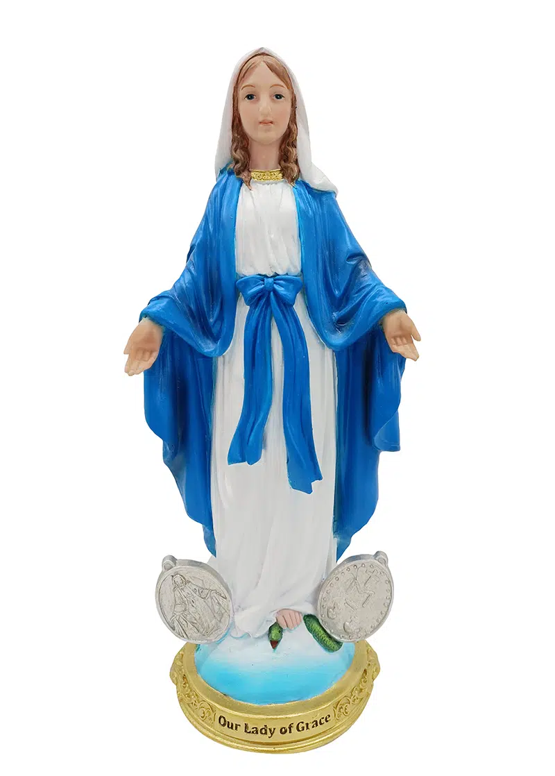 Our Lady of Grace depicts Our Lady, standing atop the earth with hands stretched out to shower grace upon the faithful who would ask for her help.