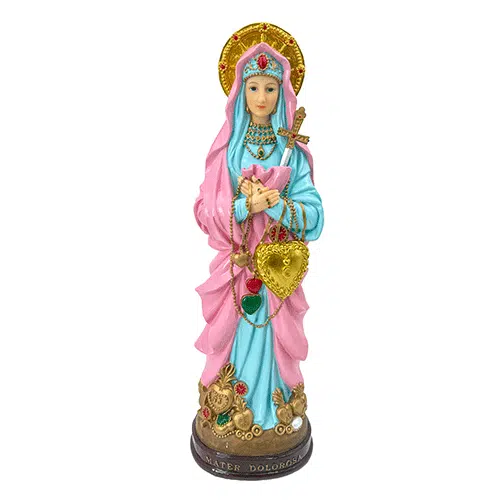 The Seven Sorrows of Mary are a popular Roman Catholic devotion. In common religious Catholic imagery, the Blessed Virgin Mary is portrayed in a sorrowful and lacrimating affect, with seven daggers piercing her heart, often bleeding. Devotional prayers that consist of meditation began to elaborate on her Seven Sorrows based on the prophecy of Simeon. Common examples of piety under this title are Servite rosary, or the Chaplet of the Seven Sorrows of Our Lady and the Seven Joys of Mary and more recently, “Sorrowful and Immaculate Heart of Mary”.
