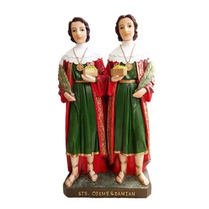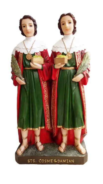 Sts. Cosmas and Damian were brothers, born in Arabia, who had become eminent for their skill in the science of medicine. Being Christians, they were filled with the spirit of charity and never took money for their services. At Egaea in Cilicia, where they lived, they enjoyed the highest esteem of the people. When the persecution under Diocletian broke out, their very prominence rendered them marked objects of persecution. Being apprehended by order of Lysias, governor of Cilicia, they underwent various torments about the year 283. Their feast day is September 26th. They are patron saints of pharmacists.(Reference: Catholic Online)